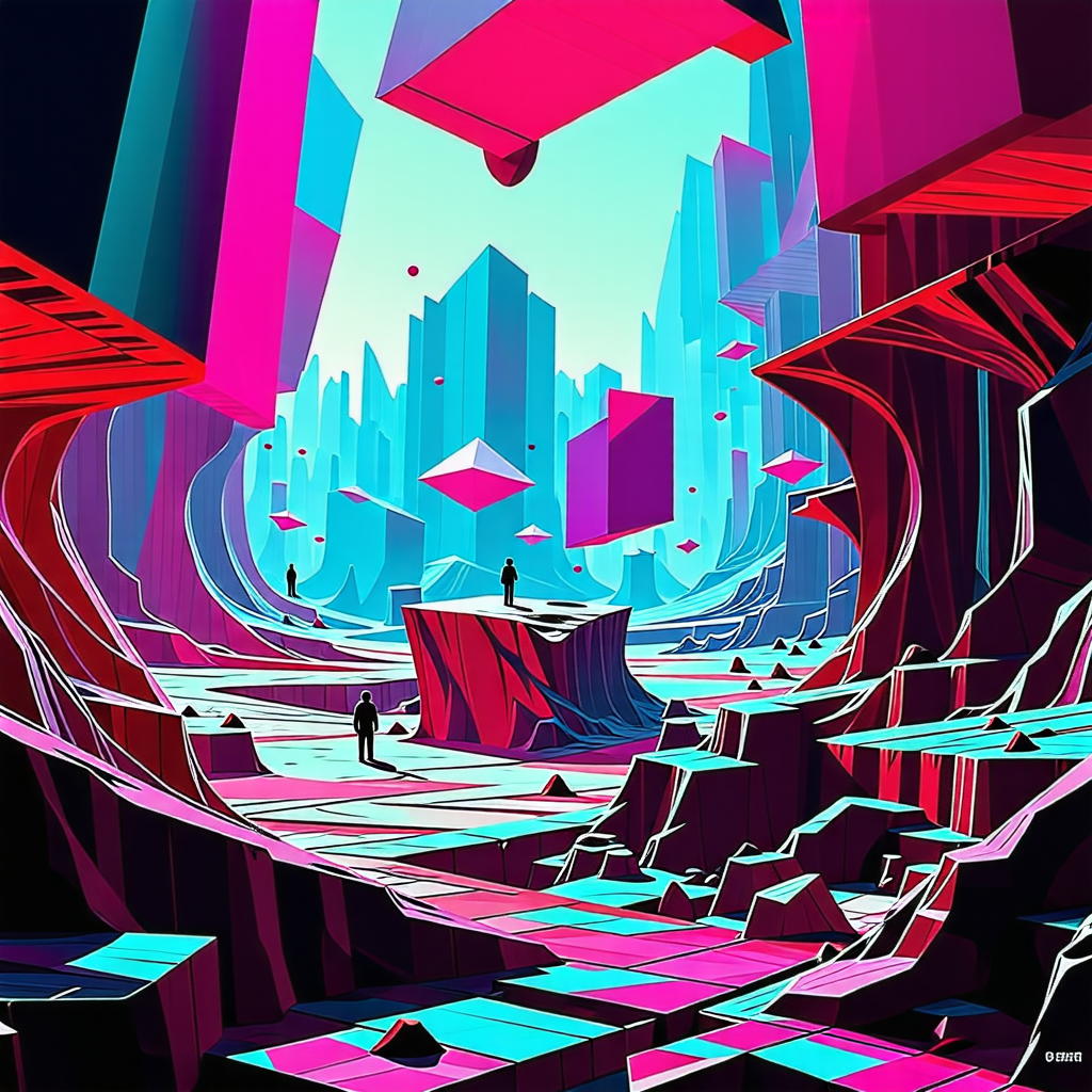 구성: 전경의 기하학적 패턴과 배경의 도시 실루엣이 조화를 이루며, 부유하는 듯한 구조물들이 중력을 무시한 듯한 느낌을 줍니다.